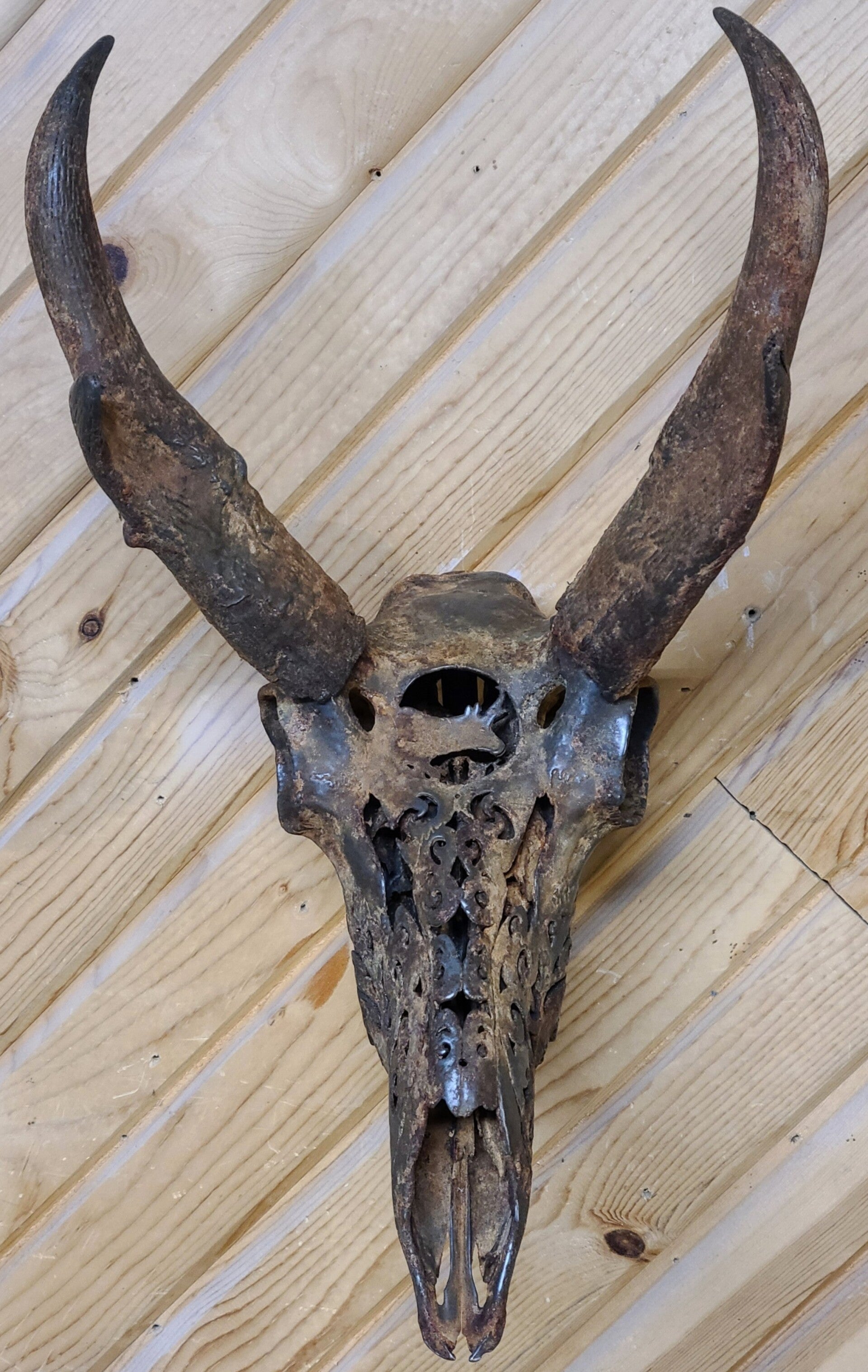 Specimen has been Cleaned,Degreased, Hand Carved, Metal Coated both Skull and Horns Rusty Iron. Includes Brown Skull Hooker Wall Hook.